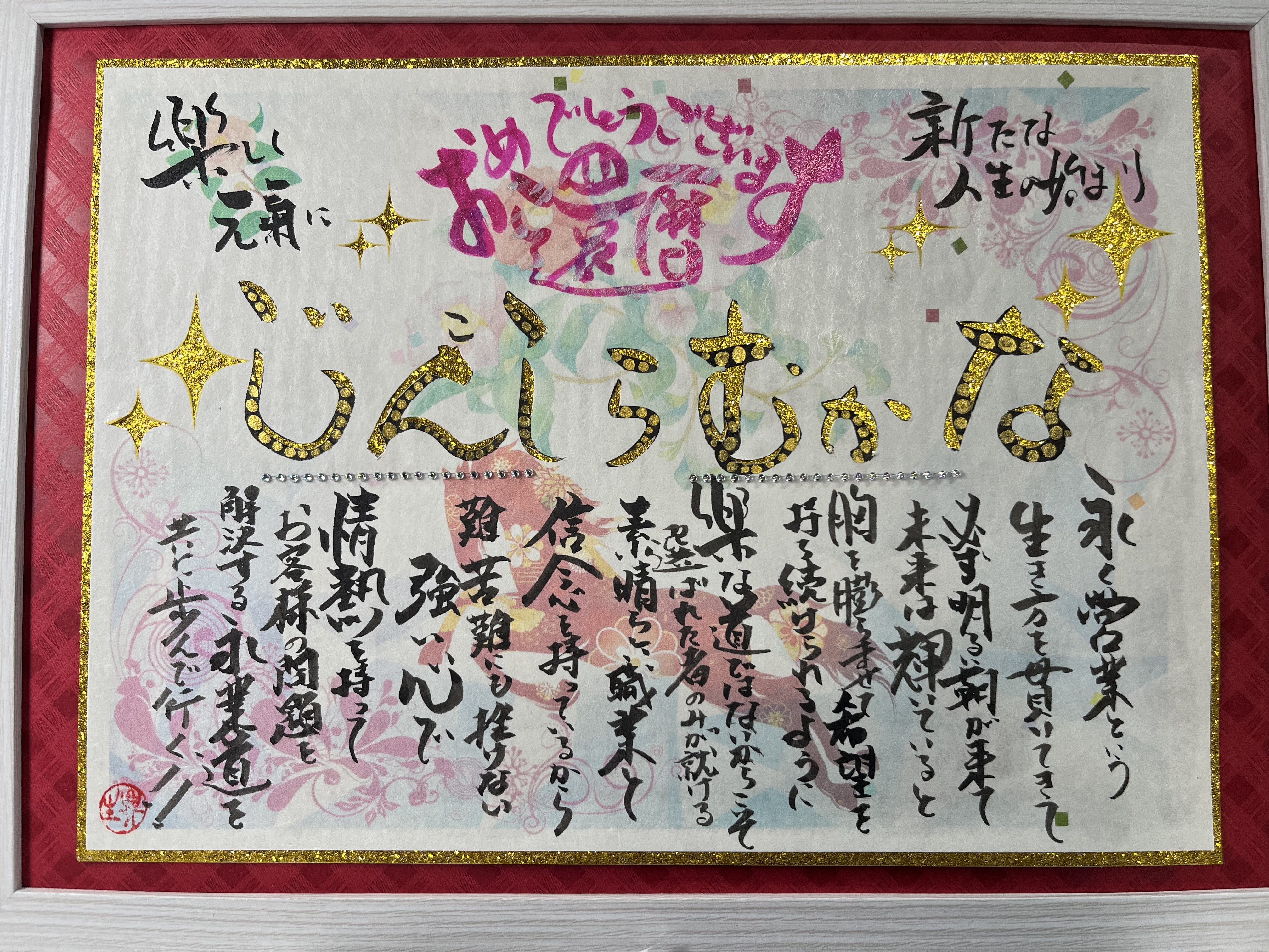 お友達の誕生日にプレゼントしたいとの事で、作成させて頂きました。私が作った文章を読んで頂いて、変更のご希望箇所を伝えて頂き、部分的に変更しました。これが一番ではないかと思います。とても良いメッセージになったと思います。