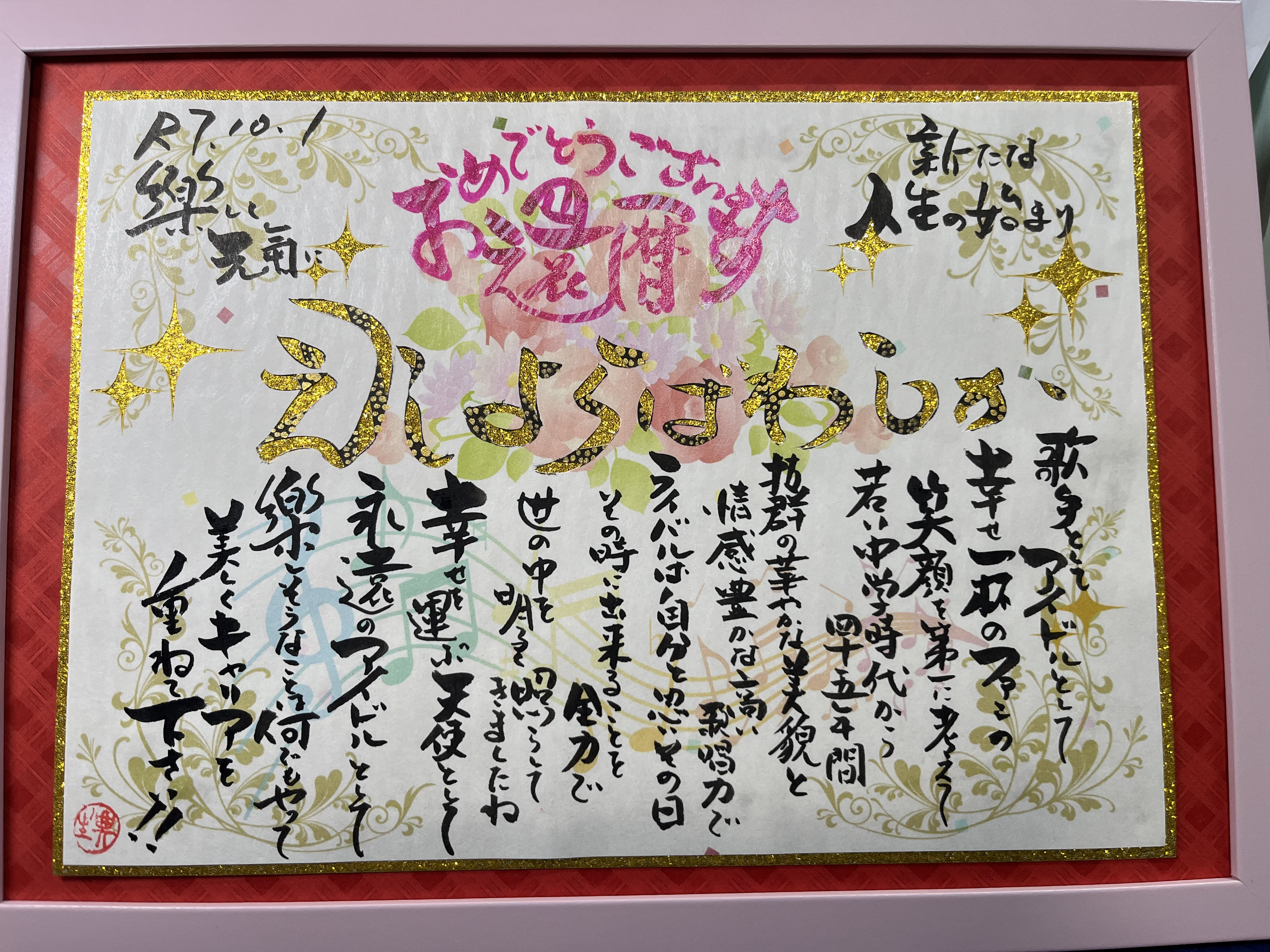 お世話になったお客様に感謝状を作ってプレゼントしました。お会いしたのは一回だけですから、どういう方で何をされているかも分かりませんので、前向きなメッセージを書かせていただきました。毎日でも良いし、何か落ち込んでいる時でも、自分の名前に込められたメッセージを読んで、少しでも元気の元になって頂けたら嬉しいと思います。