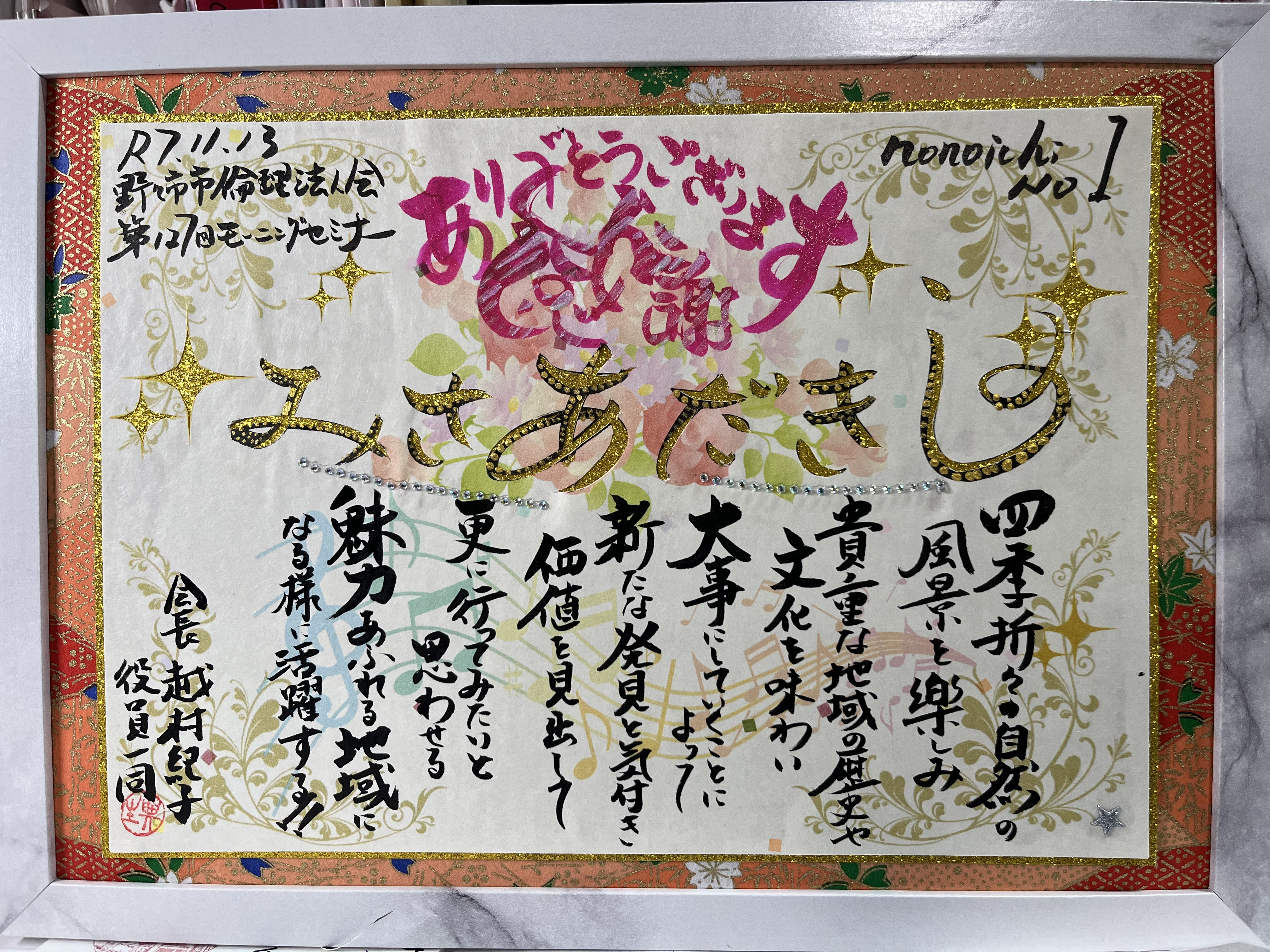 名前で作る感謝状・名前で作るメッセージ・名前で作る詩など、名前を使って文章を作成して額に入れてプレゼントに如何でしょうか?