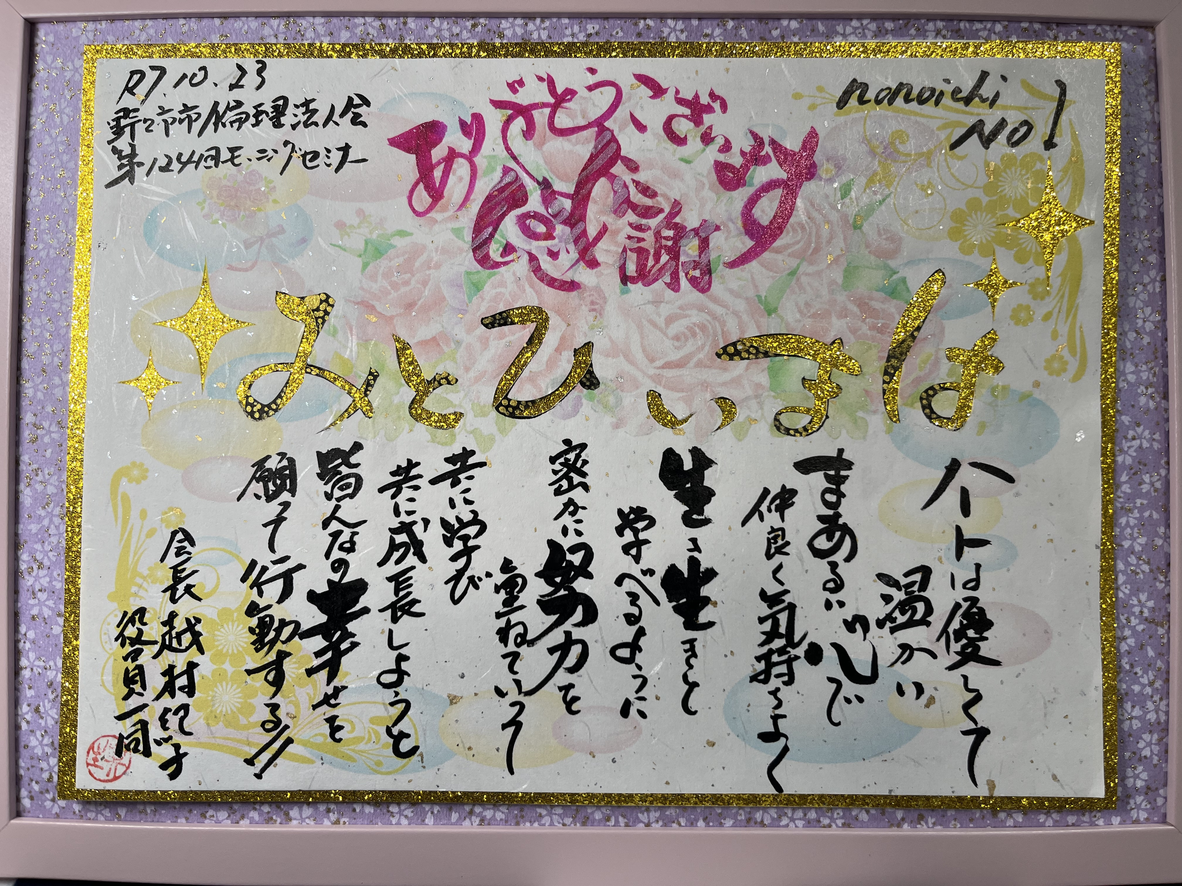 名前で作る感謝状・名前で作るメッセージ・名前で作る詩など、名前を使って文章を作成して額に入れてプレゼントに如何でしょうか?