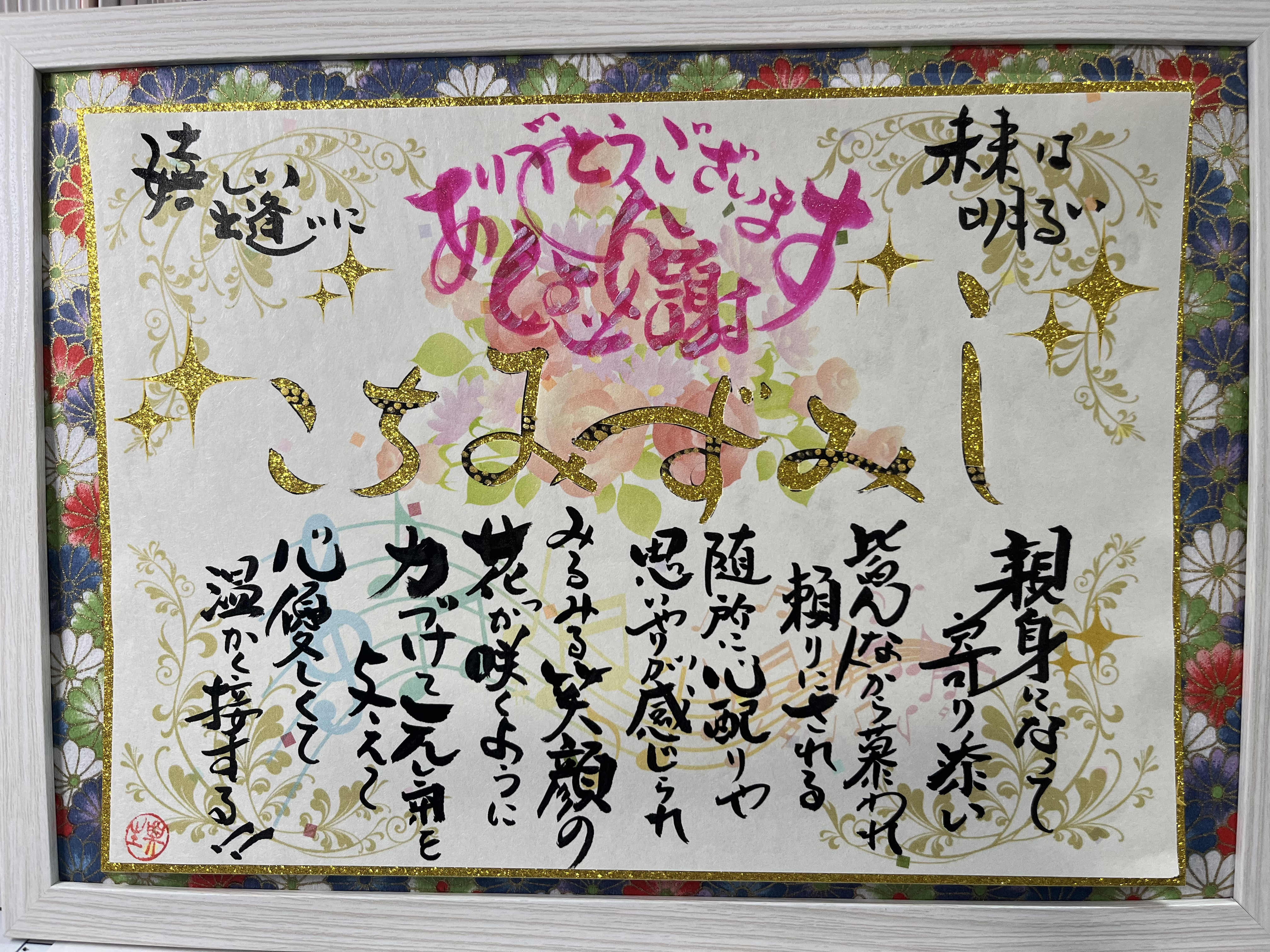 名前で作る感謝状・名前で作るメッセージ・名前で作る詩など、名前を使って文章を作成して額に入れてプレゼントに如何でしょうか?