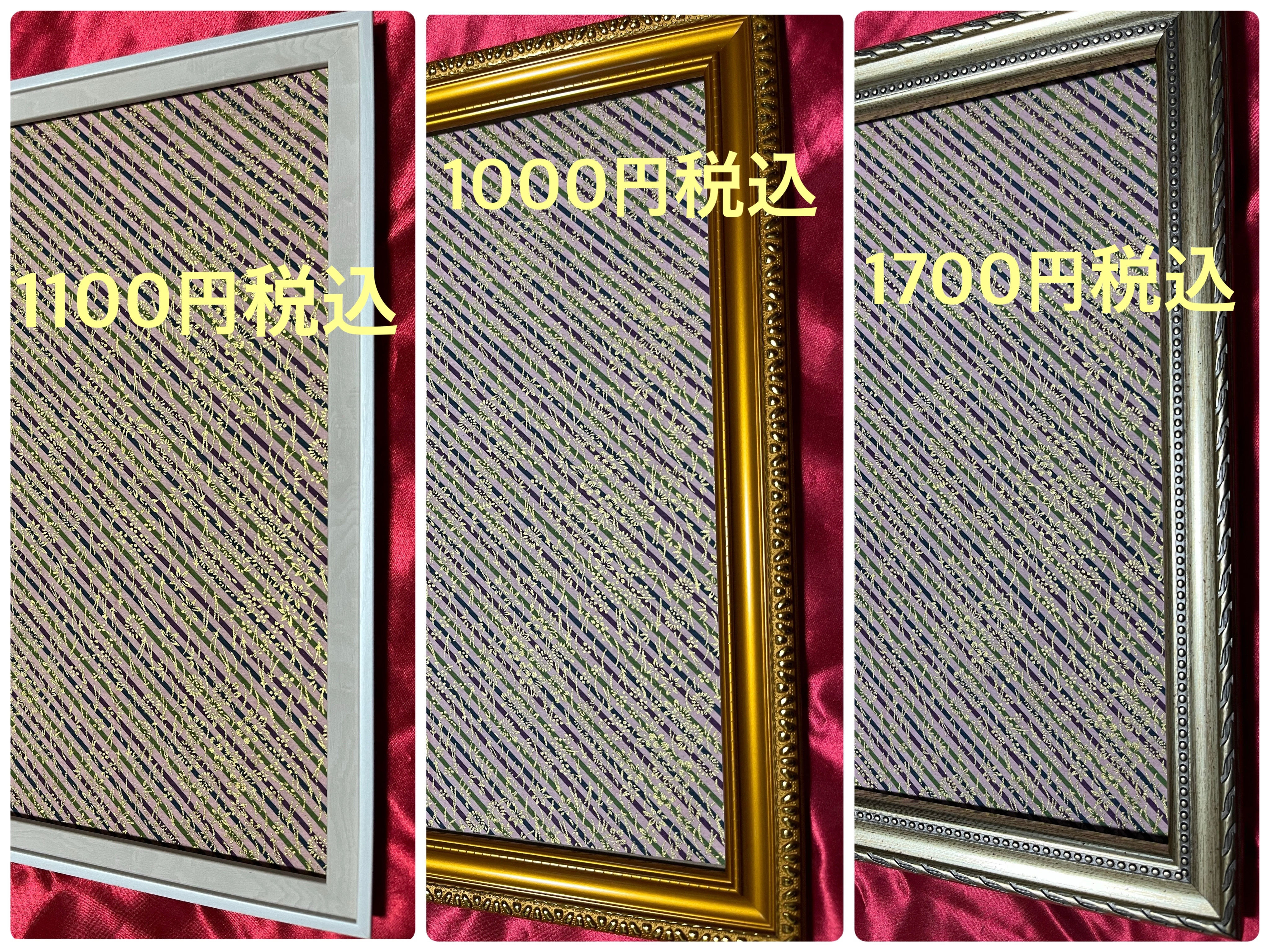 ご希望の額に入れます。これ以外に110円税込の額もあります。またご自身で額に入れるのであれば、本体だけお送り致します。